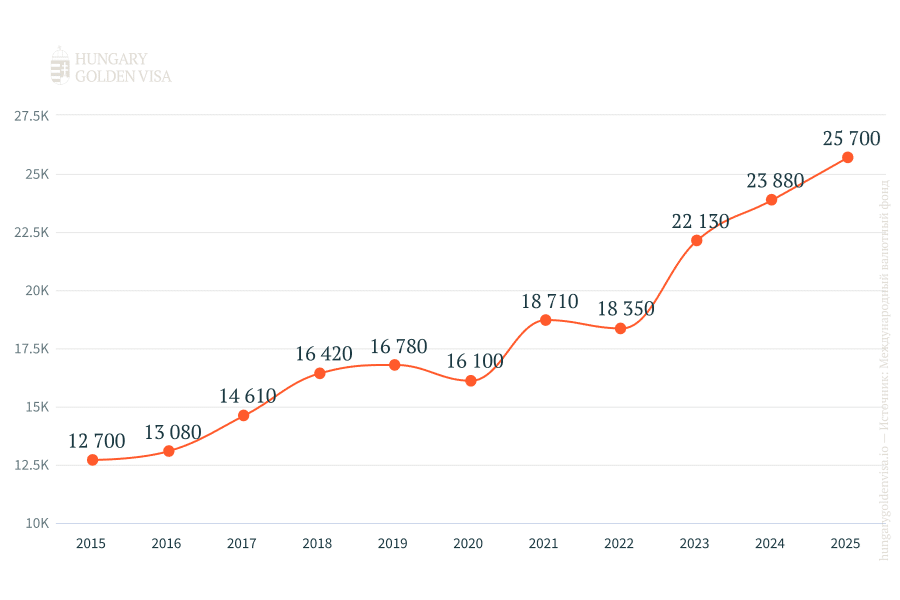 - Стабильная экономика Венгрии. ВВП Венгрии на душу населения непрерывно растет. В 2025 году этот показатель составляет 25 700 $. По прогнозам, к 2029 году он вырастет на 38% и достигнет отметки 32 750 $.